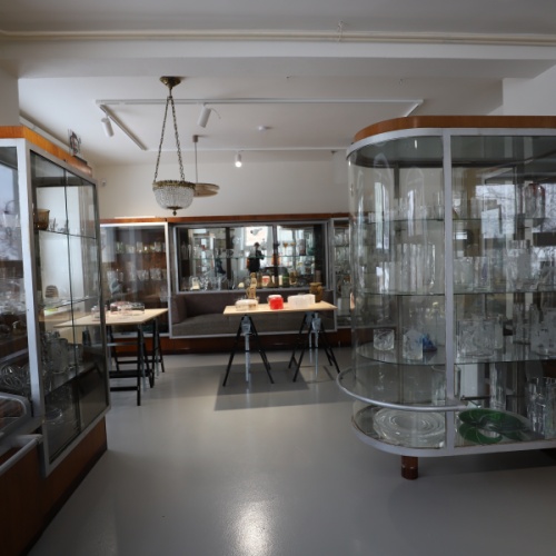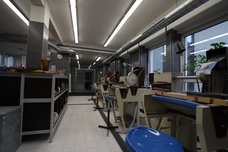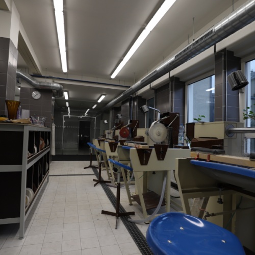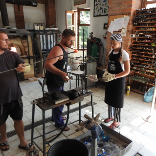 Jiří Pačinek při její výstavbě nepočítal pouze s vlastní budovou, která vedle sklářské hutě disponuje ještě brusírnou, sklady, technickým zázemím a také prodejní galerií, ale myslel také na veřejný prostor a na to, aby se krásou skla mohli pokochat jak návštěvníci sklárny a obce, tak i místní obyvatelé a vytvořil zde překrásnou Křišťálovou zahradu. Místo, kde se krása a půvab křehkého skla snoubí s divokými barvami, exotickými tvary a nápaditými kreacemi…